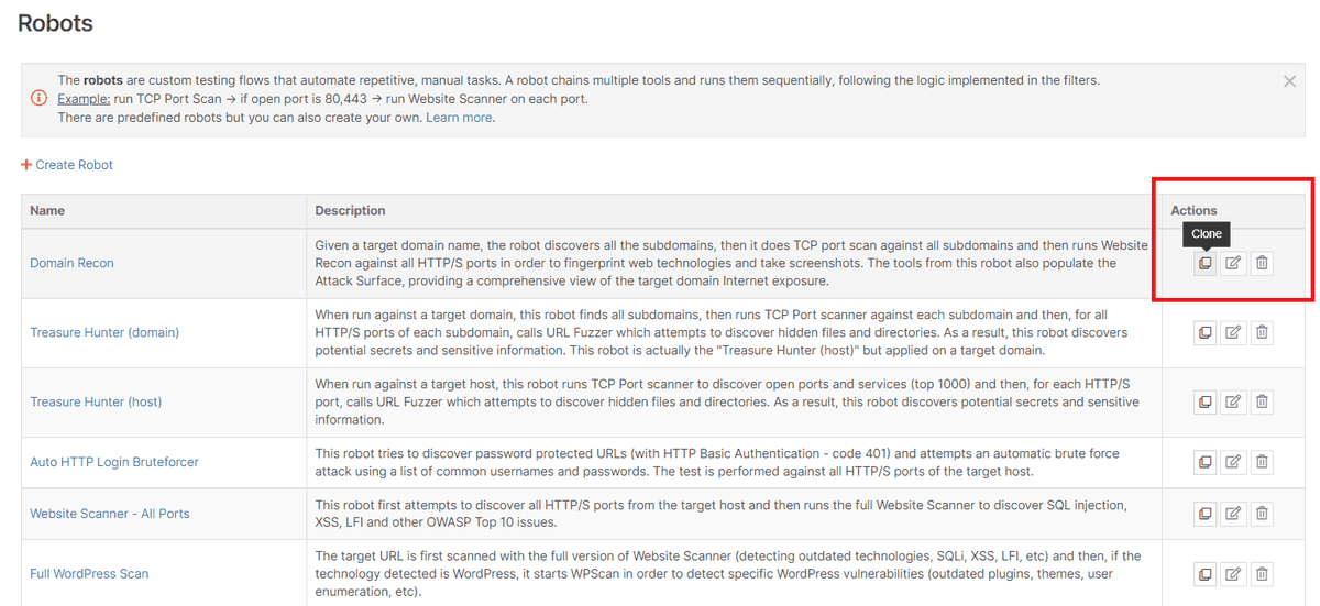 If you’re a heavy user of our pentest robots automation feature, you can now clone a predefined pentest robot or any of the robots you’ve already built.